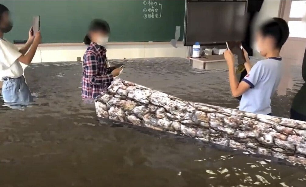 浸水被害を体験できる「AR浸水体験」が始まると、普段から見慣れている場所や、一緒に体験している友達が水に沈んでいることに大騒ぎしていました。しかし、「濁流で足元が見えなくなった」「胸のあたりまで水が来ている」と驚く場面もあり、楽しさの中にも“災害の怖さ”をリアルに体感している様子が見受けられました。